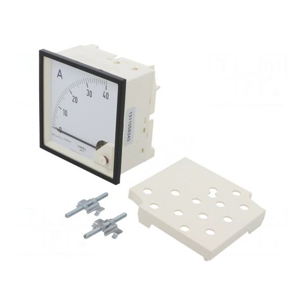 Amperomierz analogowy przeznaczony do montażu panelowego służy do pomiaru prądu stałego w zakresie od 0 do 40A. Urządzenie realizuje pomiar pośredni z wykorzystaniem bocznika 60mV przy maksymalnym dopuszczalnym napięciu pracy 600V. Instrument charakteryzuje się klasą dokładności 1,5 oraz długością skali wynoszącą 95mm.