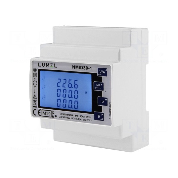 Licznik cyfrowy NMID30-1 przeznaczony jest do montażu na szynie DIN w sieciach 3-fazowych. Urządzenie realizuje pomiar napięcia AC, prądu AC, mocy czynnej, biernej i pozornej, a także częstotliwości, współczynnika mocy oraz parametrów THD. Pomiar energii czynnej i biernej odbywa się w klasie dokładności B, przy użyciu metody pośredniej z przekładnikiem prądowym 5A. Maksymalny prąd wynosi 6A, a zakres częstotliwości pracy mieści się w przedziale 45–65Hz.