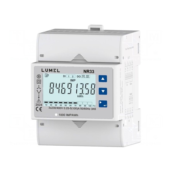 Cyfrowy licznik montażowy NR33 M0 przeznaczony jest do bezpośredniego pomiaru parametrów sieci elektrycznych jedno- i trójfazowych w układach 3- i 4-przewodowych. Urządzenie umożliwia monitorowanie napięcia AC, prądu AC, częstotliwości, mocy czynnej, biernej i pozornej, a także współczynnika mocy, harmonicznych oraz THD. Zapewnia dwukierunkowy pomiar energii elektrycznej z obsługą dwóch taryf, co umożliwia precyzyjne monitorowanie poboru oraz oddawania energii.