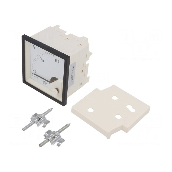 Woltomierz analogowy przeznaczony do montażu panelowego służy do ciągłego monitorowania napięcia stałego w zakresie od 0 do 100V. Urządzenie charakteryzuje się klasą dokładności 1,5 oraz maksymalnym dopuszczalnym napięciem roboczym na poziomie 0,6kV. Konstrukcja miernika pozwala na odczyt za pomocą skali o długości 61mm przy pozycji pracy urządzenia ustalonej na 90°.