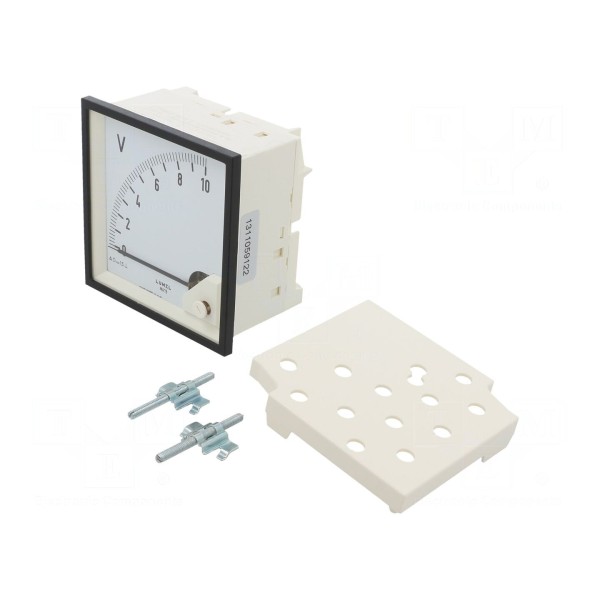 Analogowy woltomierz montażowy przeznaczony jest do pomiaru napięcia stałego w zakresie od 0 do 10V. Urządzenie charakteryzuje się klasą dokładności 1,5 oraz dopuszczalnym napięciem maksymalnym wynoszącym 0,6kV. Konstrukcja miernika obejmuje skalę o długości 95mm, której pozycja pracy wynosi 90°.
