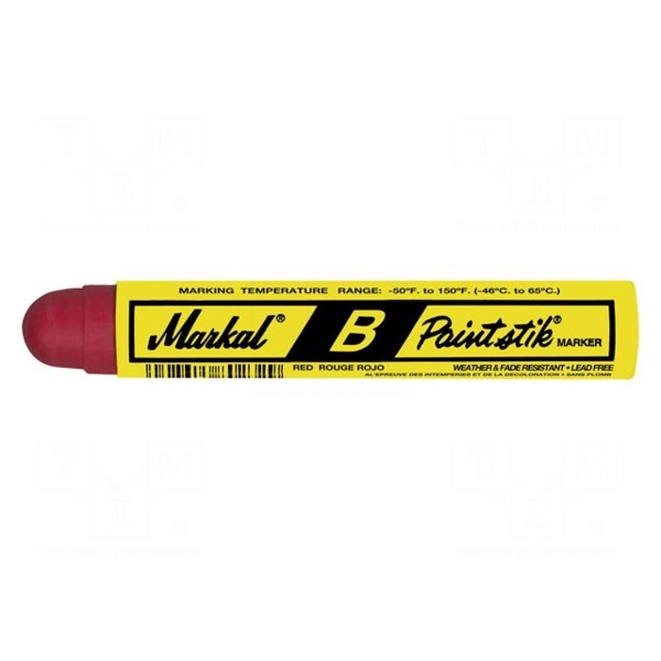 Pisak MARKAL PAINTSTIK B to przyrząd znakujący wyposażony w okrągłą końcówkę oraz wkład z farbą stałą w kolorze czerwonym. Konstrukcja produktu obejmuje papierowy uchwyt, który ogranicza zabrudzenia dłoni podczas użytkowania. Narzędzie nie wymaga ostrzenia końcówki, co wpływa na ciągłość pracy.
