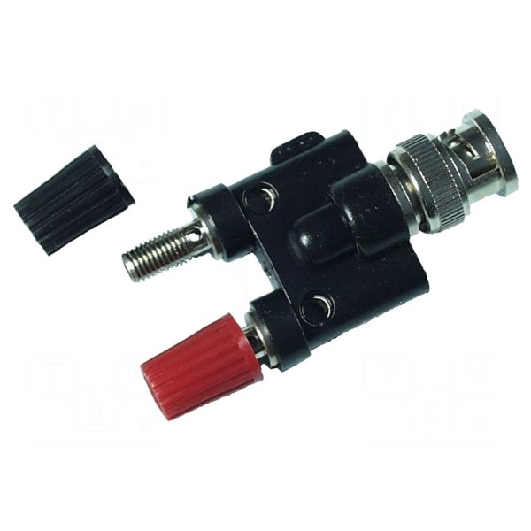 Adapter przeznaczony do połączeń w układach pomiarowych, wyposażony w gniazdo BNC oraz dwa wtyki lamelkowe. Urządzenie umożliwia przesył sygnałów przy prądzie znamionowym wynoszącym 3A.