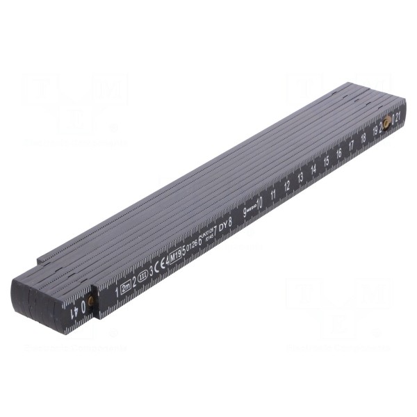Przymiar składany o długości całkowitej 2m służy do dokonywania pomiarów liniowych. Narzędzie zostało wykonane w kolorze czarnym.