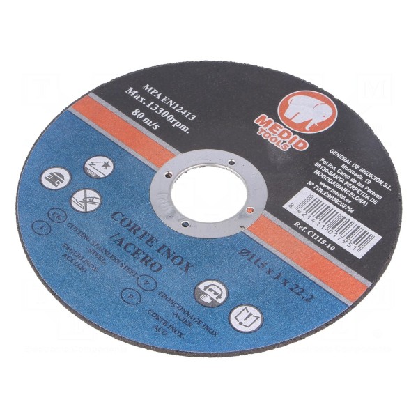 Tarcza tnąca przeznaczona jest do obróbki materiałów takich jak metal oraz stal nierdzewna. Element charakteryzuje się średnicą wynoszącą 115mm oraz grubością tarczy równą 1mm.