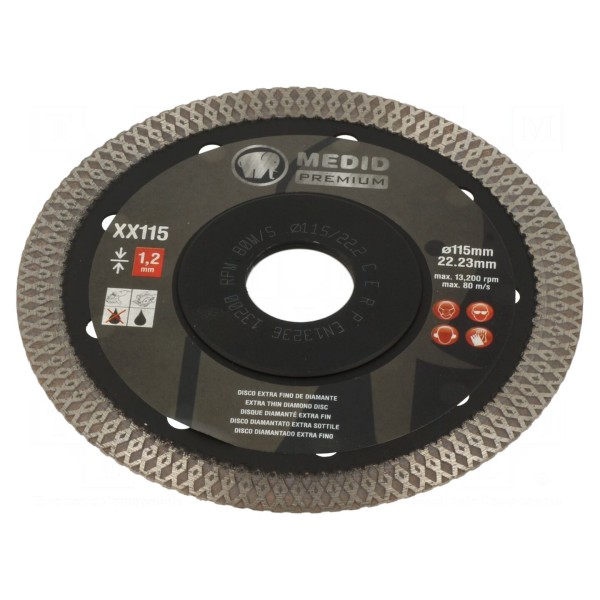 Tarcza tnąca o średnicy zewnętrznej 115 mm i grubości 1,2 mm przeznaczona jest do obróbki twardych materiałów. Narzędzie zostało przystosowane do cięcia granitu, kamienia oraz porcelany.