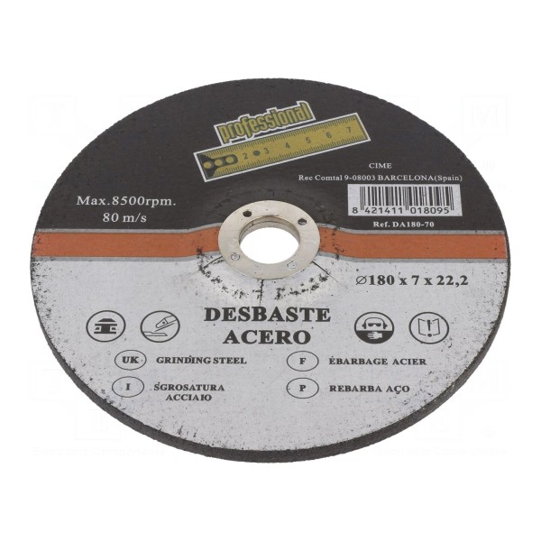 Tarcze szlifierskie przeznaczone są do obróbki metalu oraz stali. Produkt charakteryzuje się średnicą wynoszącą 180 mm oraz grubością tarczy równą 7 mm.