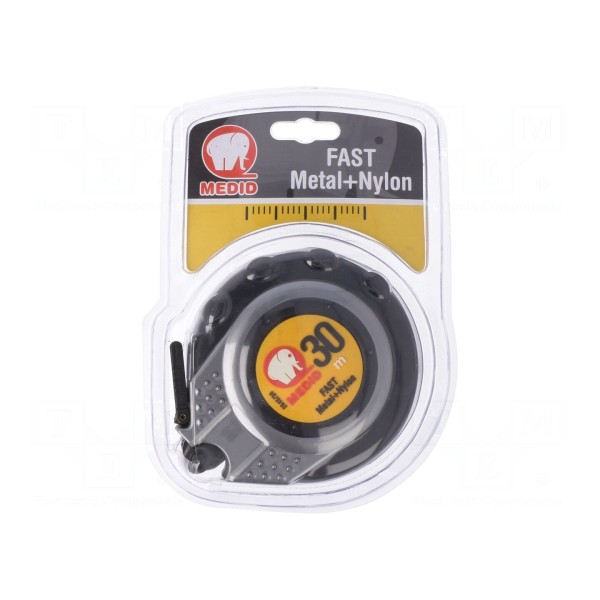 Taśma pomiarowa o długości 30 m służy do precyzyjnych prac pomiarowych na dystansie. Szerokość taśmy wynosi 15 mm, co pozwala na czytelne odczytywanie skali podczas wykonywania zadań w terenie lub warsztacie.