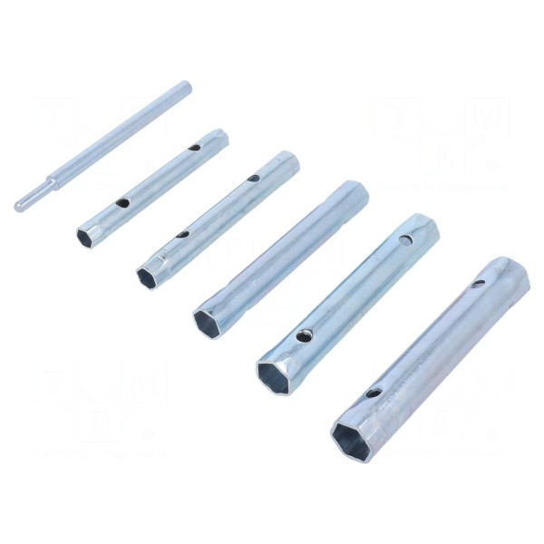 Zestaw zawiera klucze rurowe wykonane w formie zestawu narzędziowego składającego się z 6 sztuk. Elementy zestawu wspierają pracę ze śrubami o rozmiarach od 8 mm do 17 mm.