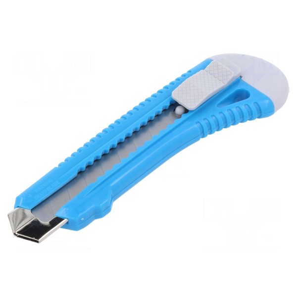 Uniwersalny nóż o całkowitej długości 150 mm i szerokości ostrza wynoszącej 18 mm. Konstrukcja narzędzia umożliwia stosowanie wysuwanego, łamanego ostrza, co pozwala na bieżące odłamywanie zużytych segmentów w celu utrzymania ostrości cięcia.