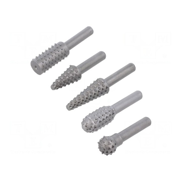Zestaw zawiera pięć pilników obrotowych przeznaczonych do obróbki metalu. Narzędzia posiadają trzpień o średnicy 6mm, co umożliwia ich montaż w standardowych elektronarzędziach.