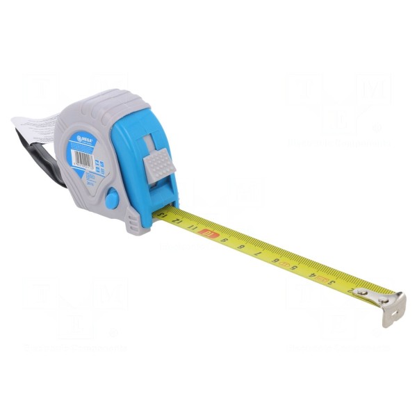 Taśma pomiarowa, określana również jako miarka, służy do wykonywania precyzyjnych pomiarów liniowych. Narzędzie posiada taśmę o długości 3 m oraz szerokości 16 mm, co zapewnia wygodę podczas prac pomiarowych w różnych warunkach.