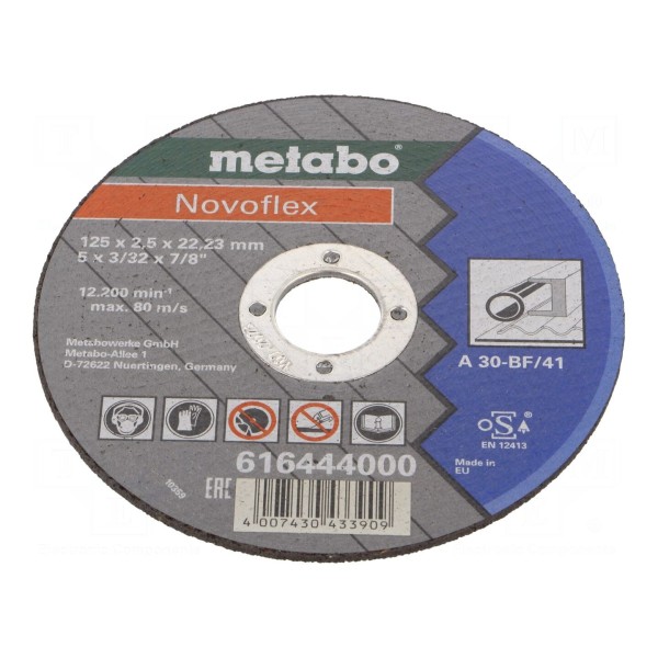 Tarcza tnąca marki Metabo przeznaczona jest do obróbki stali. Średnica zewnętrzna elementu wynosi 125mm, przy grubości tarczy ustalonej na 2,5mm.