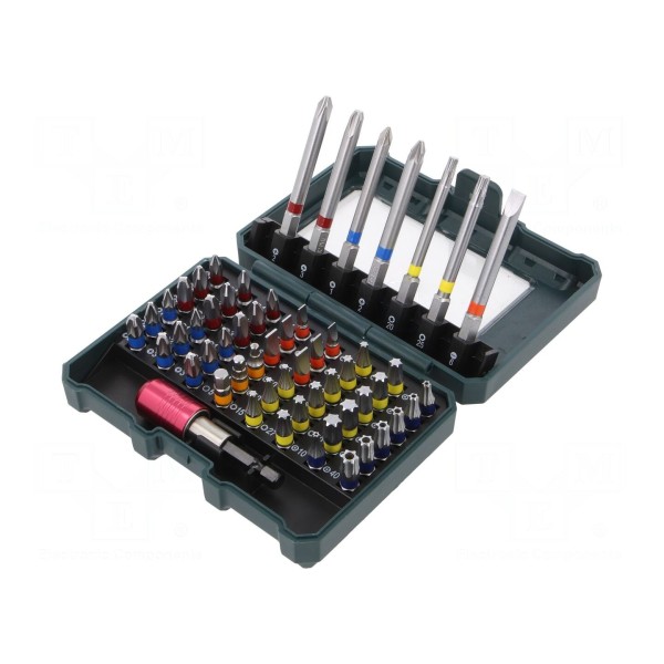 Zestaw zawiera 56 sztuk końcówek wkrętakowych wykonanych ze stali chromowo-wanadowej. W skład kompletu wchodzą groty typu imbus, Phillips, płaskie, Pozidriv, Torx oraz Torx z zabezpieczeniem, co pozwala na wszechstronne zastosowanie narzędzi podczas prac montażowych i serwisowych.