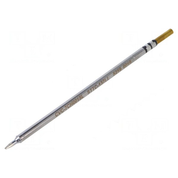 Grot typu wkrętak o wymiarach 1,8x10 mm przeznaczony jest do stacji lutowniczych wyposażonych w technologię Connection Validation oraz SmartHeat. Element został zintegrowany z grzałką, co zapewnia efektywną transmisję energii cieplnej podczas prac montażowych.