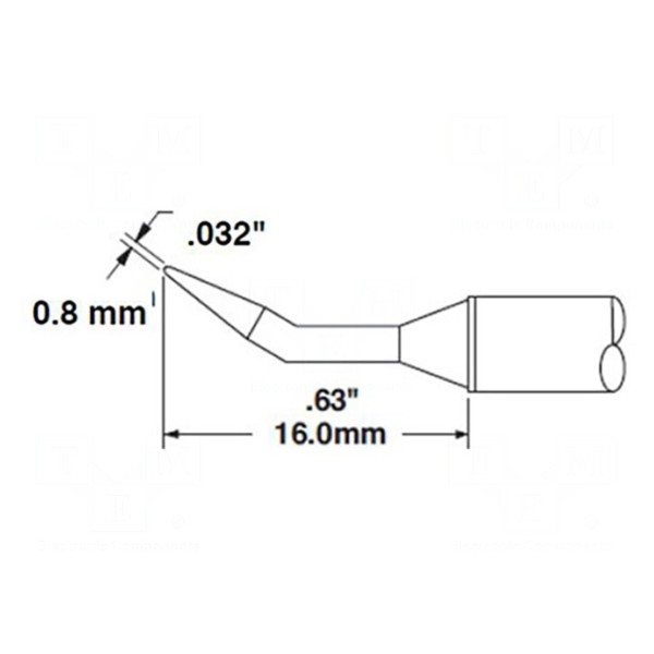 Grot zagięty stożek o wymiarach 0,8x16mm przeznaczony jest do wykorzystania w stacjach lutowniczych. Element charakteryzuje się wbudowaną grzałką, co wpływa na parametry przekazywania ciepła podczas procesów lutowniczych. Temperatura pracy grota wynosi 413°C.
