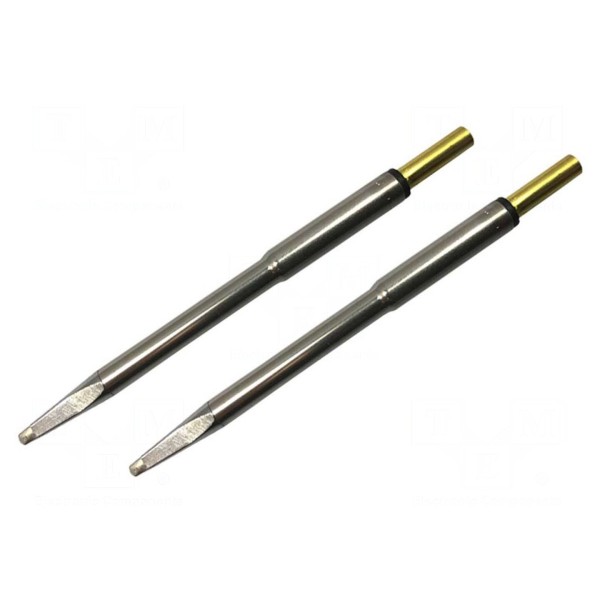 Grot z grzałką o kształcie tnącym przeznaczony jest do wykorzystania z gorącymi szczypcami. Element charakteryzuje się wymiarem końcówki wynoszącym 2mm oraz stałą temperaturą pracy osiągającą 413°C.