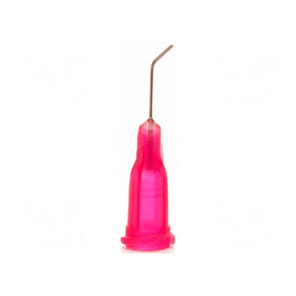 Igła dozująca o rozmiarze 25 wykonana ze stali. Element posiada zagięcie pod kątem 45° oraz standardowe mocowanie typu Luer Lock, co umożliwia szybki montaż w dozownikach. Długość elementu wynosi 0,5 cala. Korpus igły wykończony jest w kolorze czerwonym.