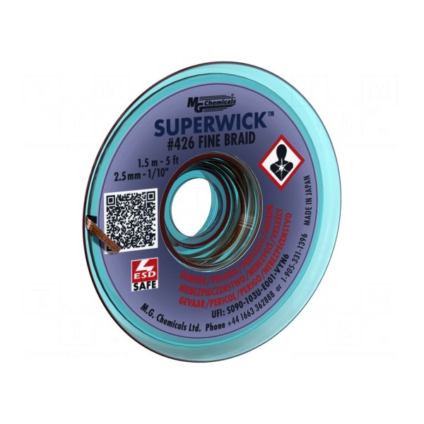 Taśma rozlutowująca wykonana z miedzi służy do usuwania nadmiaru spoiwa lutowniczego z płytek drukowanych. Produkt o szerokości 2,5 mm i długości 1,5 m zapewnia wydajne oczyszczanie ścieżek oraz wylutowywanie elementów wrażliwych na temperaturę.