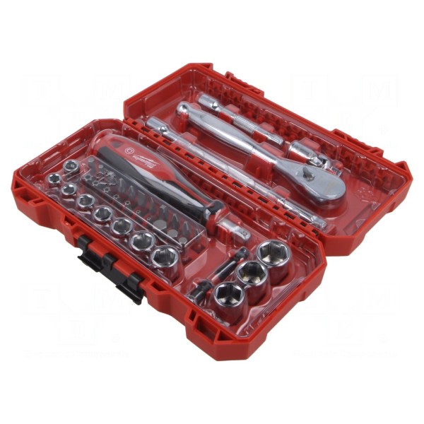 W zestawie: grzechotka 1/4", końcówki wkrętakowe, nasadki 6-kątne 1/4", przedłużacz do końcówek nasadowych, rękojeść wkrętakowa. Narzędzia dostarczane są w opakowaniu zbiorczym zapewniającym organizację elementów podczas pracy.