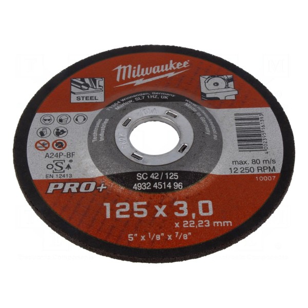 Tarcza tnąca Milwaukee przeznaczona jest do obróbki stali stopowej. Narzędzie charakteryzuje się średnicą wynoszącą 125 mm oraz grubością tarczy równą 3 mm.