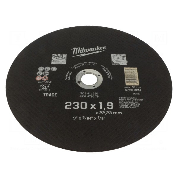 Tarcza tnąca Milwaukee przeznaczona jest do obróbki stali. Element charakteryzuje się średnicą zewnętrzną wynoszącą 230mm oraz grubością tarczy równą 1,9mm.