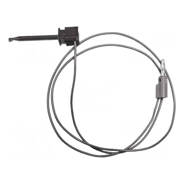 Przewody pomiarowe wyposażone w chwytak haczykowy oraz wtyk bananowy 4 mm przeznaczone są do wykonywania połączeń w układach pomiarowych. Elementy stykowe wykonano z miedzi berylowej, natomiast izolację przewodu stanowi PVC. Długość całkowita wynosi 1,2 m, a kolor przewodu to czarny.