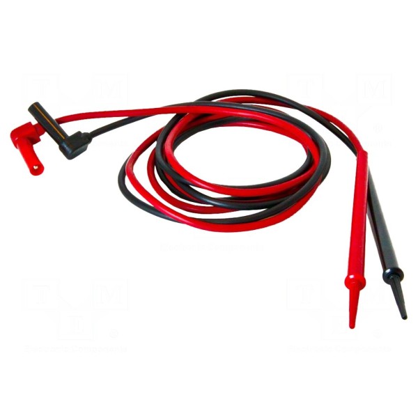 Zestaw zawiera przewody pomiarowe wyposażone w końcówkę pomiarową oraz kątowy wtyk bananowy o średnicy 4 mm. Komponenty charakteryzują się napięciem znamionowym 0,6 kV oraz prądem znamionowym 20 A.
