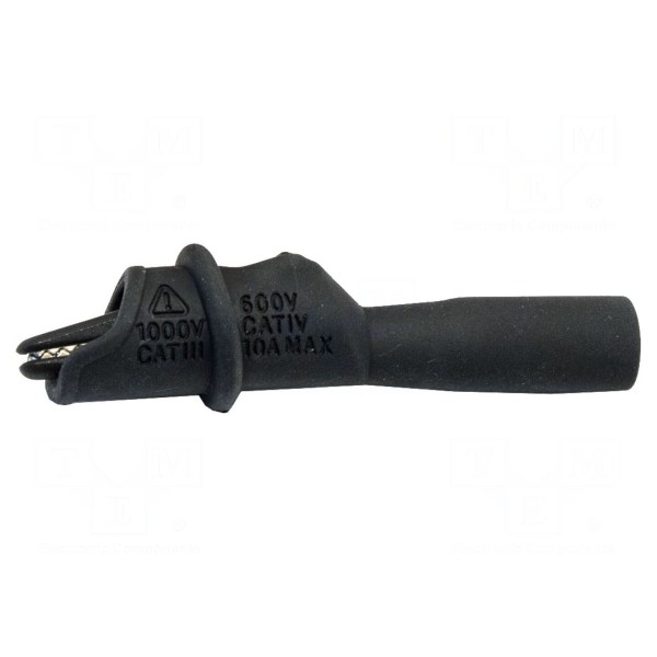 Zacisk krokodylkowy przeznaczony jest do prac pomiarowych przy napięciu znamionowym do 1kV oraz prądzie do 10A. Element wyposażony jest w gniazdo 4mm, co umożliwia kompatybilność z typowymi przewodami pomiarowymi. Maksymalny zakres chwytania wynosi 8,9mm.