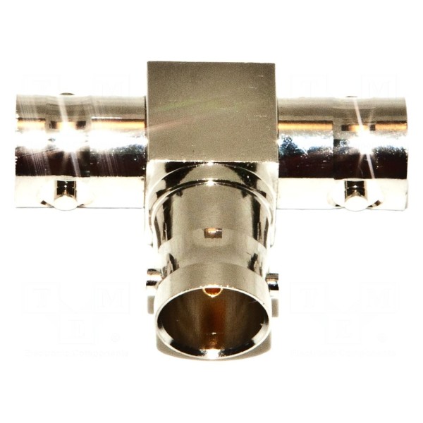 Złącze laboratoryjne typu BNC przeznaczone do pracy w systemach o impedancji 75Ω. Konstrukcja elementu obejmuje trzy gniazda żeńskie typu BNC oraz trzy wtyki BNC, co pozwala na rozdzielenie lub sumowanie sygnałów w układach pomiarowych.