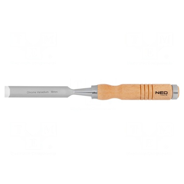 Narzędzie przeznaczone do precyzyjnej obróbki drewna. Szerokość końcówki roboczej wynosi 18mm, co pozwala na wykonywanie wgłębień oraz kształtowanie powierzchni w materiałach drewnianych.
