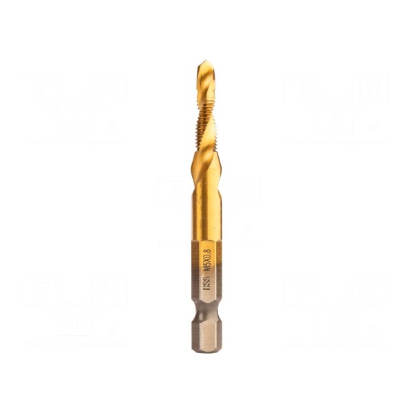 Gwintownik przeznaczony jest do wykonywania gwintów wewnętrznych o rozmiarze M5 i skoku 0,8 mm. Narzędzie zostało wykonane ze stali szybkotnącej HSS, co wpływa na jego trwałość podczas obróbki mechanicznej.