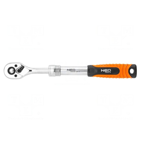 Klucz typu grzechotka NEO TOOLS o rozmiarze gniazda uchwytu 1/2" wyposażony jest w mechanizm o 72 zębach. Teleskopowa konstrukcja narzędzia umożliwia regulację długości w zakresie od 305 mm do 445 mm, co pozwala na dostosowanie zasięgu do wykonywanej pracy.