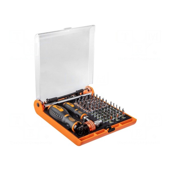 Zestaw kluczy obejmuje 73 elementy wykonane ze stali. Komplet zawiera różnorodne rodzaje grotów, w tym imbus, Phillips, płaski, Pozidriv, Torx oraz Y (TP).