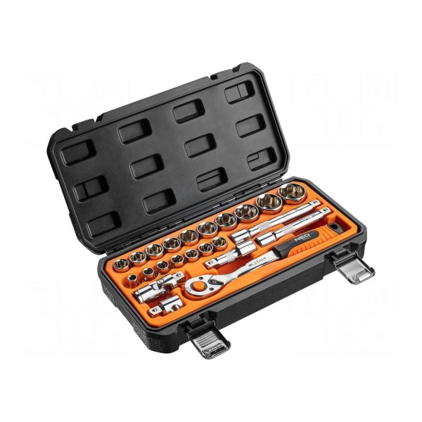 Zestaw zawiera klucze nasadowe 6-kątne oparte na napędzie 1/2". Komplet składa się z 23 elementów, w tym grzechotki 1/2" oraz nasadek 6-kątnych o rozmiarach HEX 17mm, 19mm i 21mm.