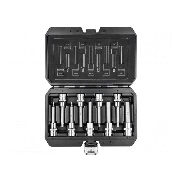 W skład kompletu wchodzą klucze o następujących rozmiarach: HEX 4 mm, 5 mm, 6 mm, 7 mm, 8 mm, 10 mm, 12 mm, 14 mm oraz 17 mm. Całość dostarczana jest w wygodnej walizce, która ułatwia przechowywanie oraz organizację narzędzi w warsztacie.