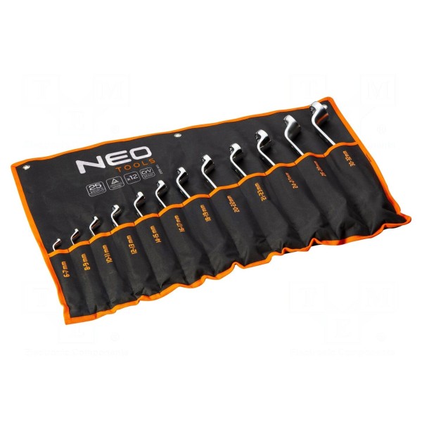Zestaw zawiera 12 kluczy oczkowych odgiętych wykonanych ze stali chromowo-wanadowej. Narzędzia te charakteryzują się konstrukcją zapewniającą dostęp w miejscach o ograniczonej przestrzeni roboczej.