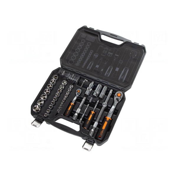 W zestawie: grzechotka 1/2", grzechotka 1/4", końcówki wkrętakowe, nasadki 6-kątne 1/2", nasadki 6-kątne 1/4". Narzędzia zostały zaprojektowane do współpracy z gniazdami uchwytu o wymiarach 1/2" oraz 1/4".