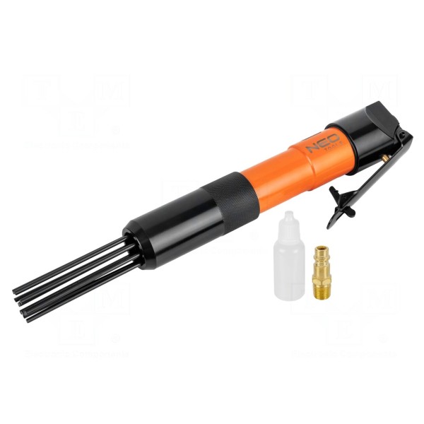 Młotek igłowy NEO TOOLS 14-031 przeznaczony jest do usuwania zanieczyszczeń oraz warstw powierzchniowych. Urządzenie zasilane jest sprężonym powietrzem o ciśnieniu roboczym 6,3 bar.