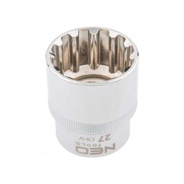 Nasadka spline 12-kątna została wykonana ze stali chromowo-wanadowej. Narzędzie posiada rozmiar gniazda 27mm oraz współpracuje z uchwytami o rozmiarze 1/2".