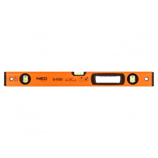 Poziomica o długości 0,6m jest narzędziem przeznaczonym do wyznaczania pionów oraz poziomów na płaskich powierzchniach. Urządzenie zostało wyposażone w trzy libelle, które umożliwiają pomiar w płaszczyźnie poziomej, pionowej oraz pod kątem 45 stopni.