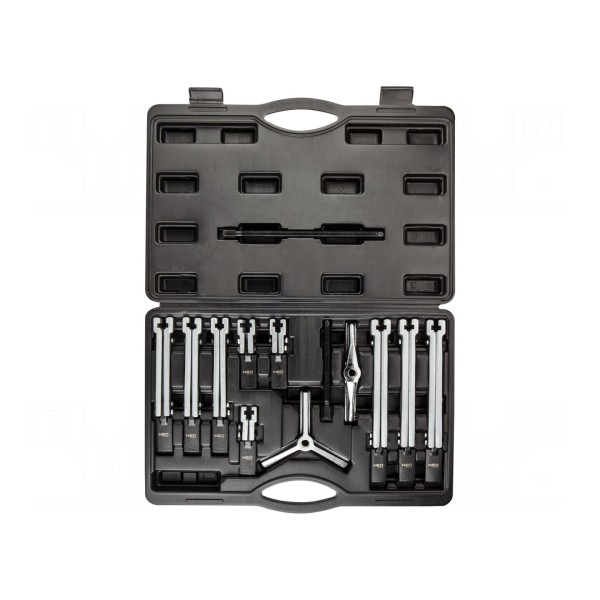 Zestaw ściągacza do łożysk zawiera 22 elementy. Narzędzie jest przeznaczone do demontażu łożysk w warunkach warsztatowych.