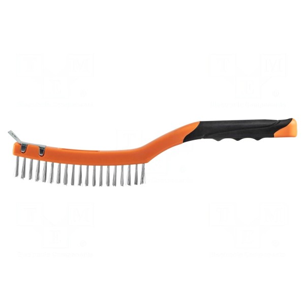 Szczotka druciana o całkowitej długości 345 mm została wyposażona w trzy rzędy włosia wykonanego ze stali nierdzewnej. Element roboczy osadzony jest na rękojeści wyprodukowanej z tworzywa sztucznego, co zapewnia stabilny chwyt podczas pracy.