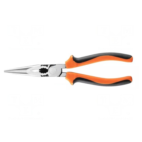 Szczypce o długości 200 mm są przeznaczone do chwytania oraz cięcia materiałów. Konstrukcja narzędzia obejmuje proste, półokrągłe i wydłużone szczęki, co pozwala na wszechstronne zastosowanie w pracach montażowych.
