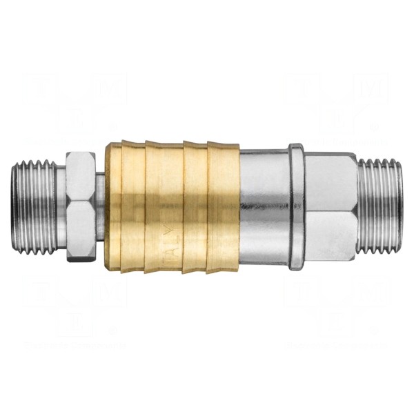 Szybkozłącze zostało wykonane z mosiądzu i wyposażone w gwint zewnętrzny o rozmiarze 3/8". Element przeznaczony jest do układów pneumatycznych zasilanych z kompresora.