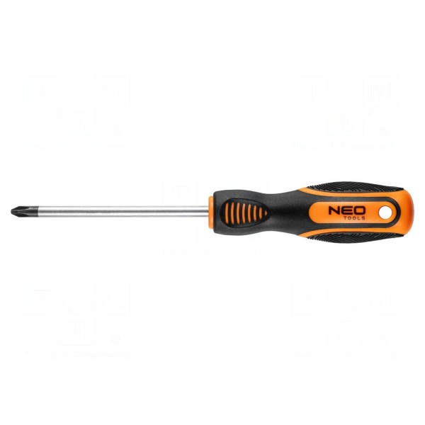 Wkrętak standardowy NEO TOOLS wyposażony jest w grot typu Phillips w rozmiarze PH2. Długość robocza ostrza wynosi 100mm, co umożliwia pracę z elementami złącznymi o odpowiednim profilu gniazda.