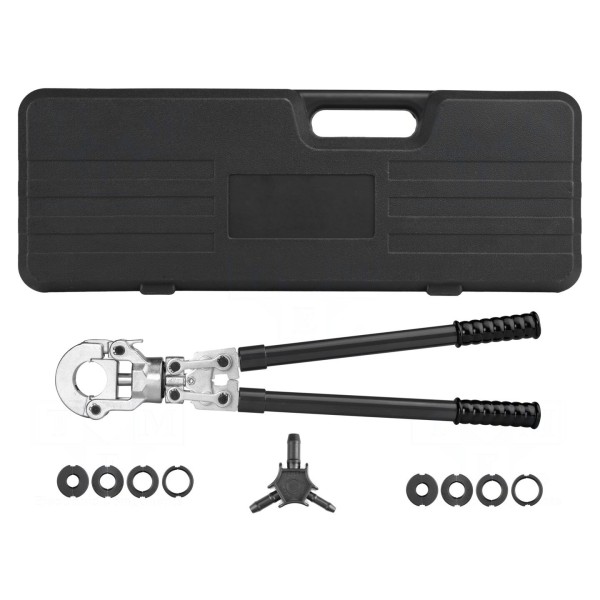 Zestaw narzędzi przeznaczony jest do zaciskania końcówek na rurach PEX. W skład kompletu wchodzi dziesięć elementów, wśród których znajdują się zaciskarka, matryca oraz kalibrator.