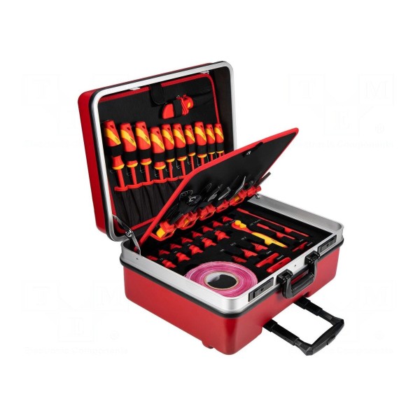 Zestaw narzędzi izolowanych o ogólnym przeznaczeniu dedykowany do prac elektrycznych pod napięciem do 1kV. Komplet składa się z 51 elementów, w tym nasadek 6-kątnych, pięciu szczypiec izolowanych oraz wkrętaków izolowanych.