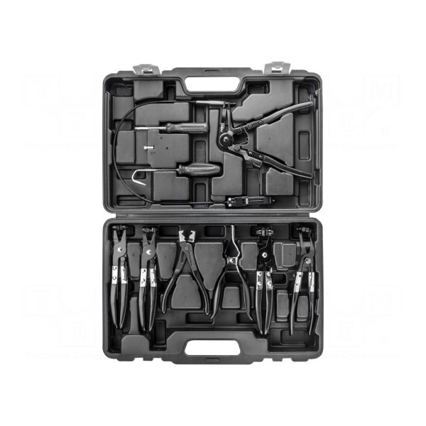 Zestaw narzędzi zawiera 9 sztuk szczypiec przeznaczonych do obsługi opasek zaciskowych. Komplet został zaprojektowany z myślą o pracach montażowych i serwisowych wymagających użycia specjalistycznych narzędzi zaciskowych.