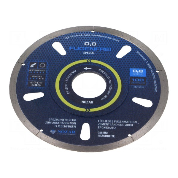 Tarcza tnąca diamentowa o średnicy 100 mm przeznaczona jest do usuwania fug. Narzędzie charakteryzuje się grubością tarczy wynoszącą 0,8 mm.